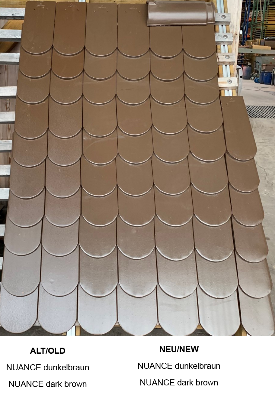 Из-за изменений в составе ангоба поставщика сырья, завод вынужден менять цвет темно-коричневый для черепицы BIBER KLASSIK круглый срез. Это изменение воспринимается как возможность дальнейшего улучшения цветовой гаммы и делает поверхность еще более элегантной.